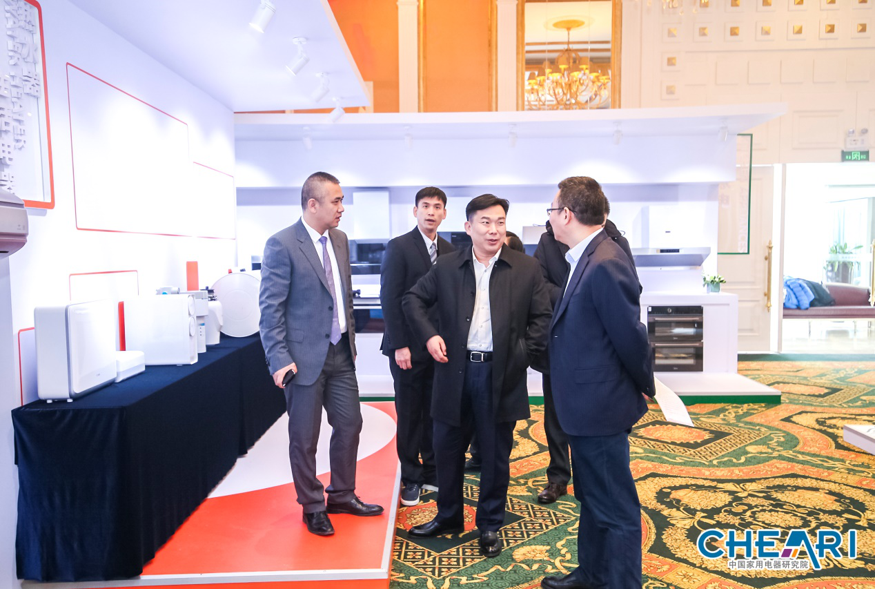 中國家用電器研究院院長劉挺(左三)參觀展示產品